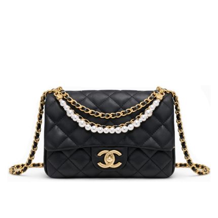 Chanel Mini Flap Bag Shiny Imitation Pearls And Gold Tone Metal Black 17Cm