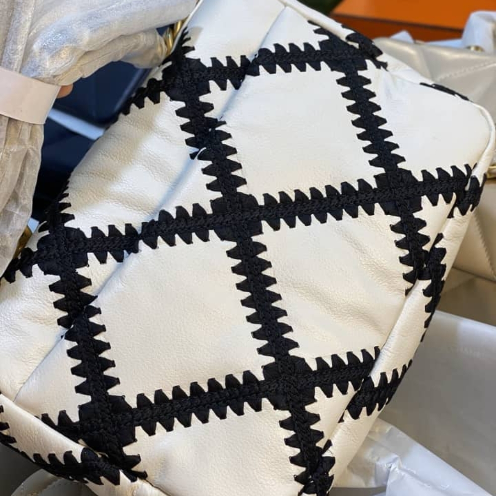 The Chanel 19 Flap Bag in white and black crochet is a standout accessory featuring a unique combination of gold and silver-tone hardware. With a stylish 24cm size, the bag boasts the iconic Chanel interlocking CC logo, exuding a modern yet timeless appeal. The contrasting colors and crochet design make it an eye-catching piece, perfect for adding a bold statement to any outfit.