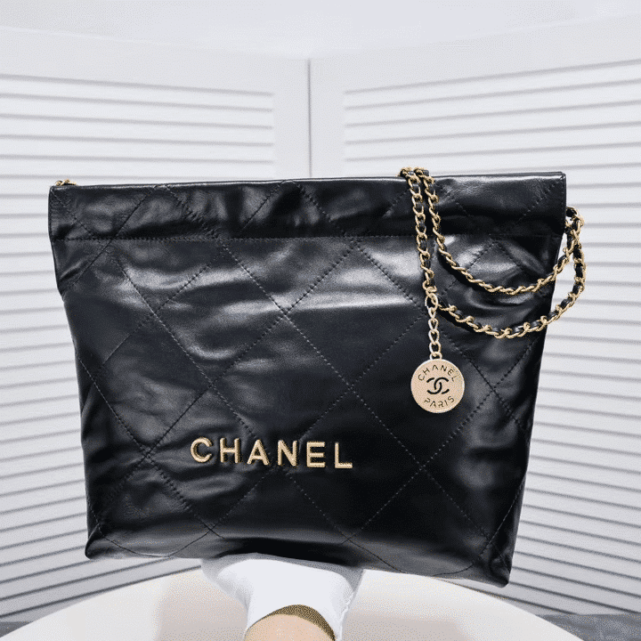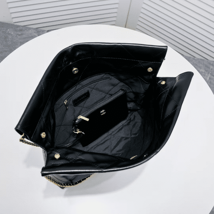 The Chanel 22 Handbag reimagines modern luxury with a relaxed, oversized silhouette. Crafted from shiny black material and accented with gold-tone metal hardware, it features the signature diamond quilting and bold CHANEL lettering for an instantly recognizable look. The soft, slouchy structure is balanced by layered chain straps, allowing comfortable shoulder or hand carry. Spacious and lightweight, this 42 cm design is ideal for everyday use while maintaining Chanel’s effortless elegance.