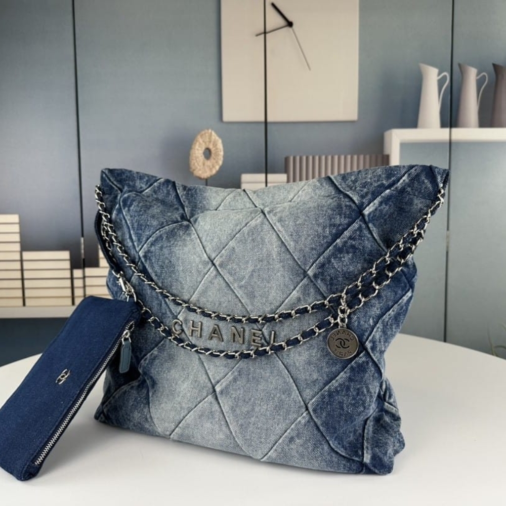 Chanel 22 Handbag Washed Denim Silver Tone Metal Blue 41Cm AS3261 B10439 NM981