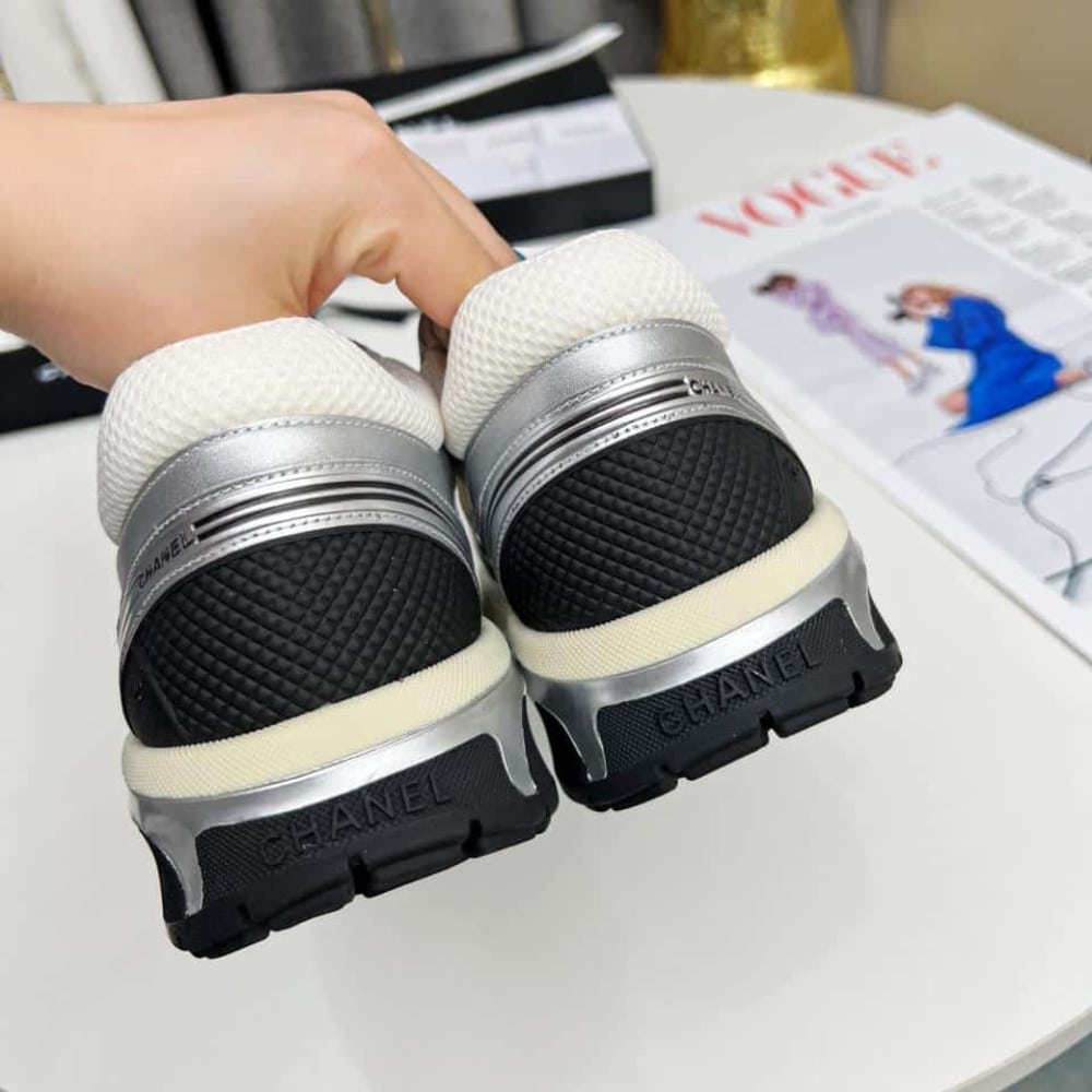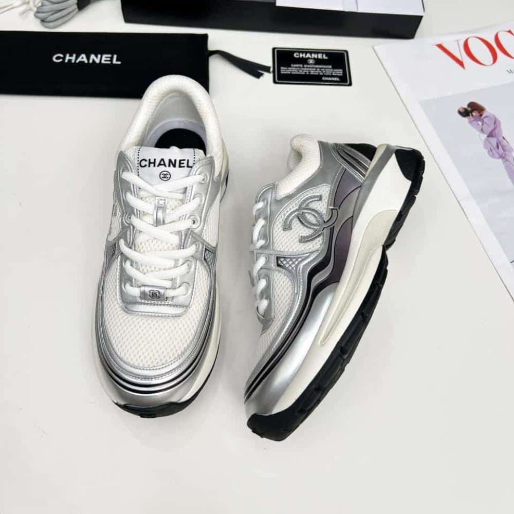 Chanel 23C Silver Metallic Cc Logo Lace Up Flat Runner Trainer Sneaker White G39792 Y56368 K5451