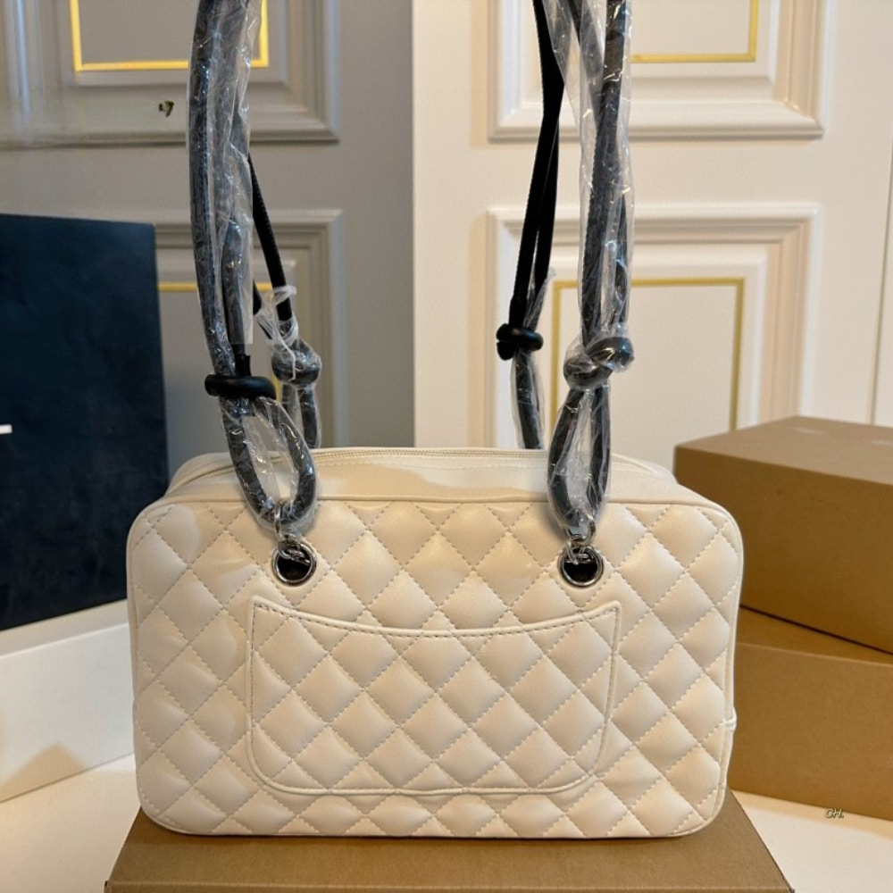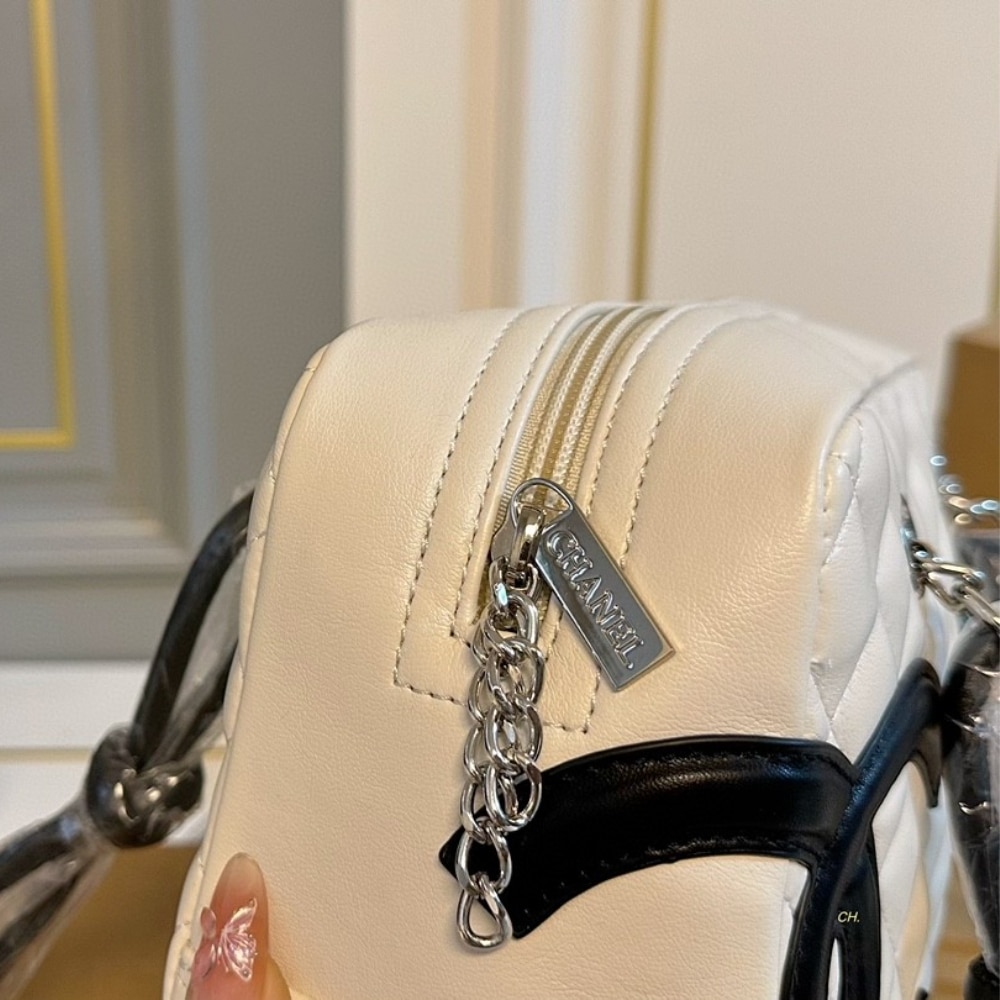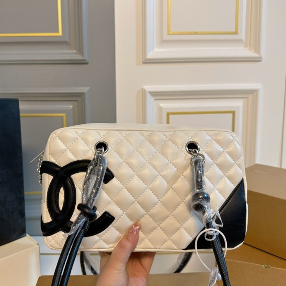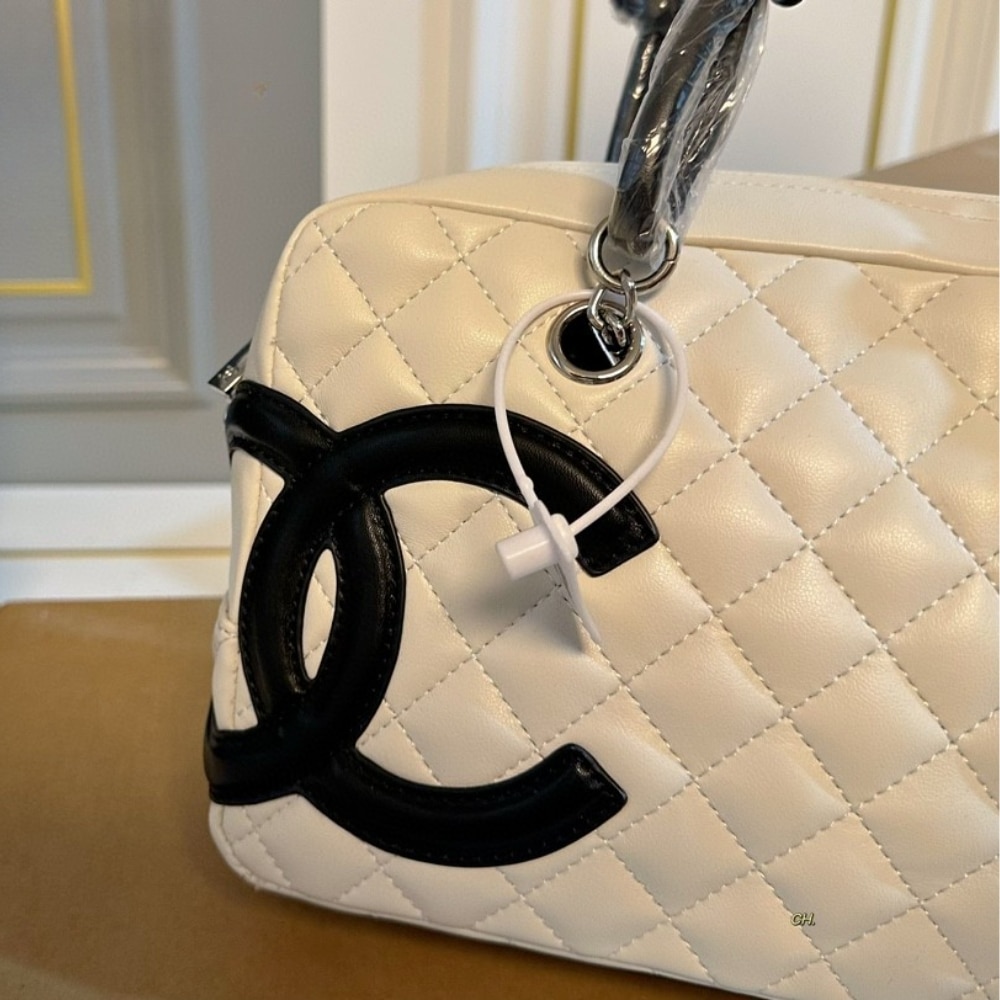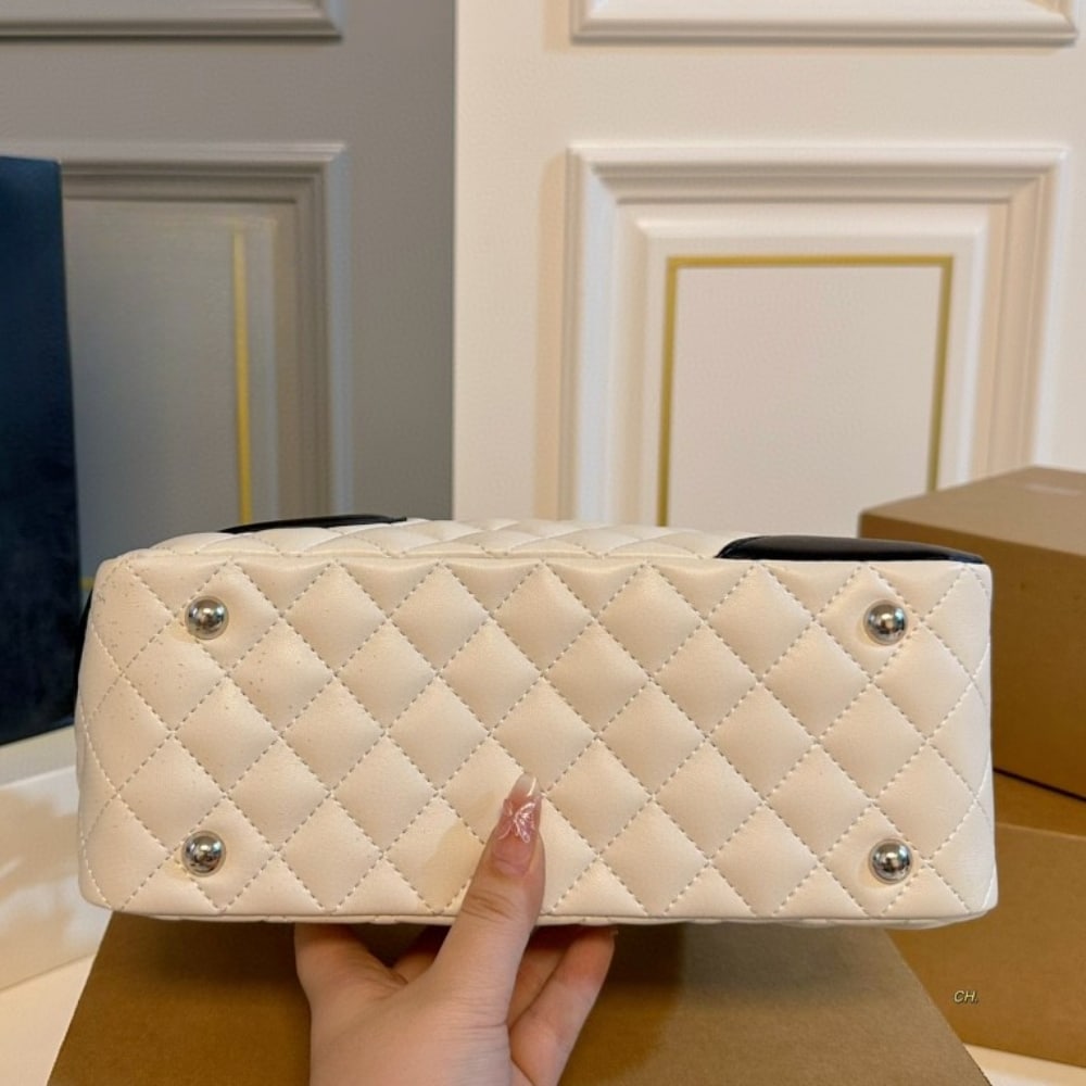 Chanel Cambon Bowler Bag Quilted Leather White And Black 26Cm