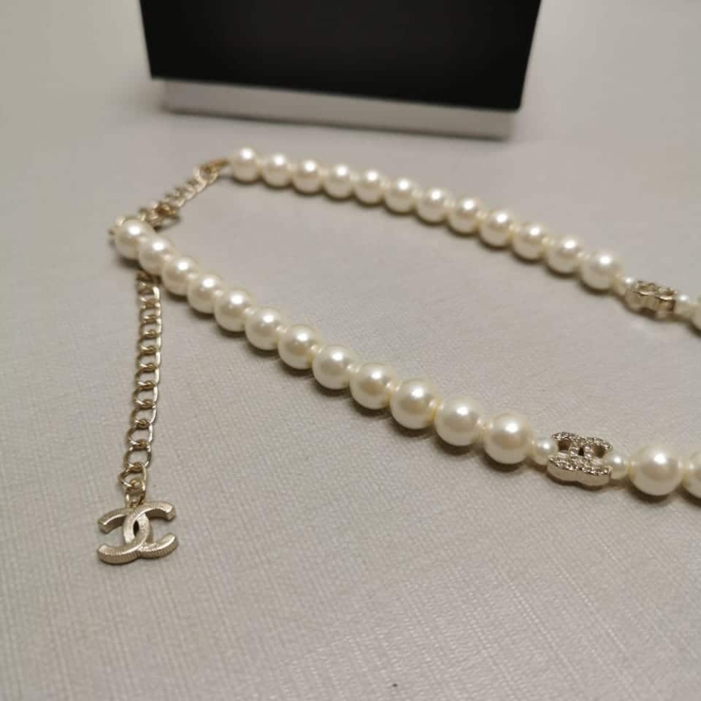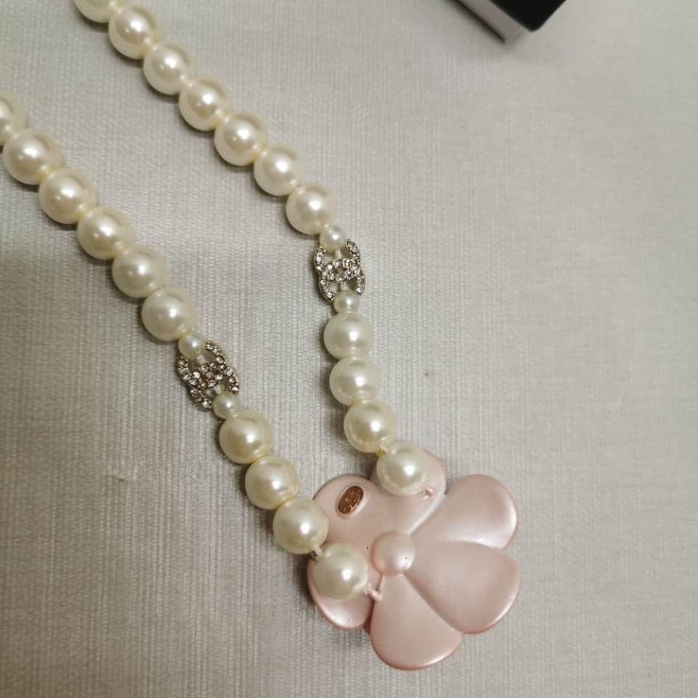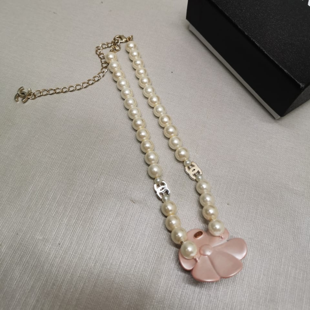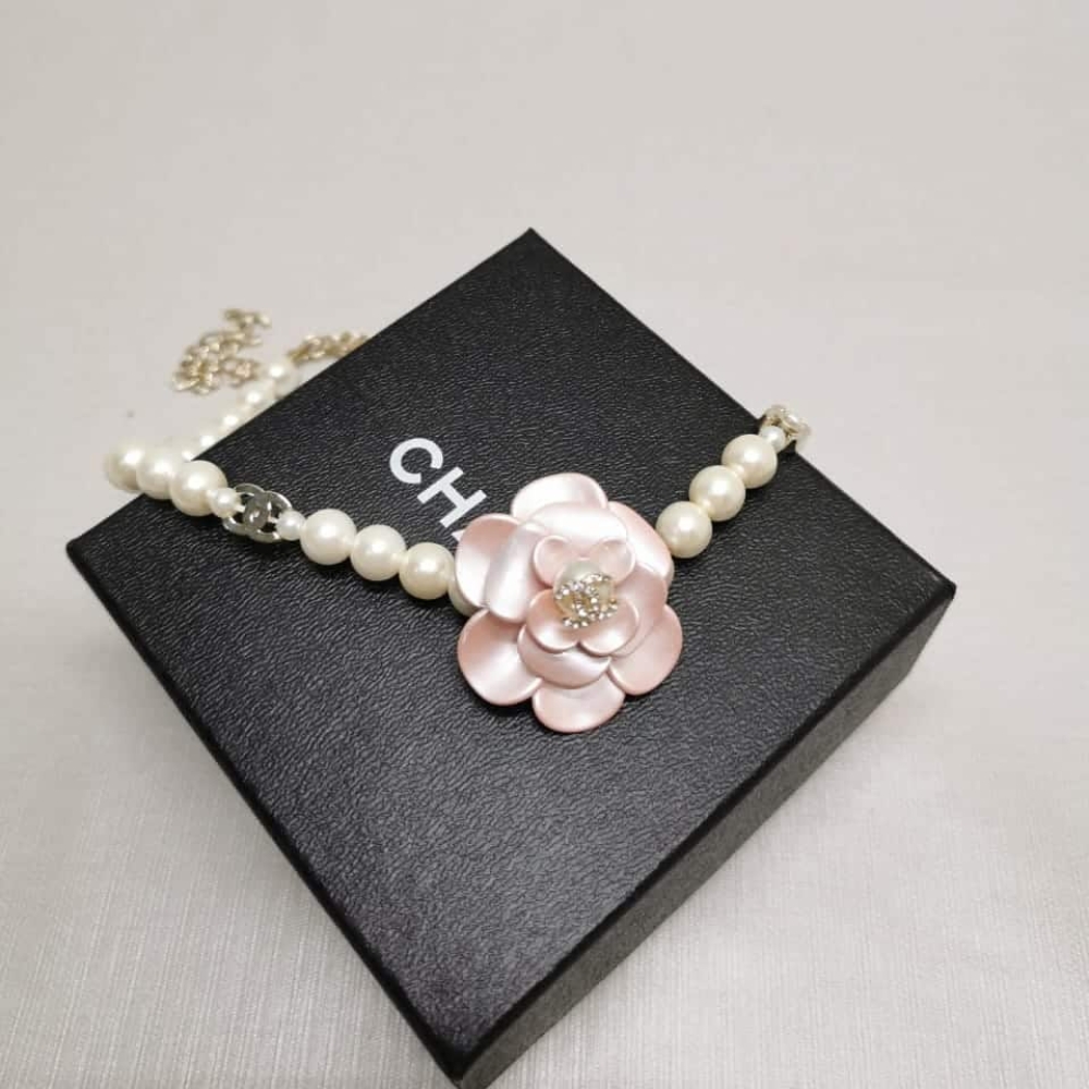 The Chanel Choker is a luxurious piece crafted from metal, glass pearls, and gold. It features a stunning pink pearly flower centerpiece and a delicate gold chain with a small Chanel logo charm. Elegant and timeless, perfect for adding a sophisticated touch to any outfit.