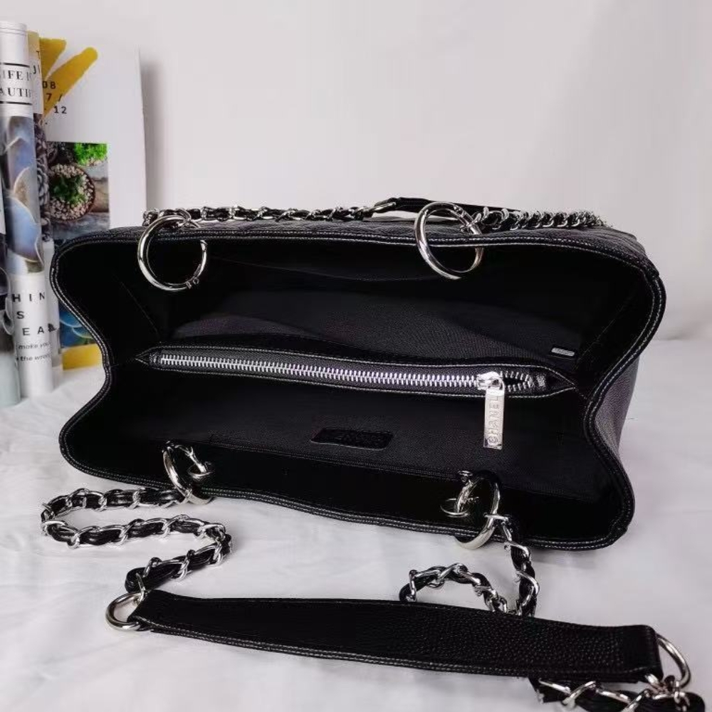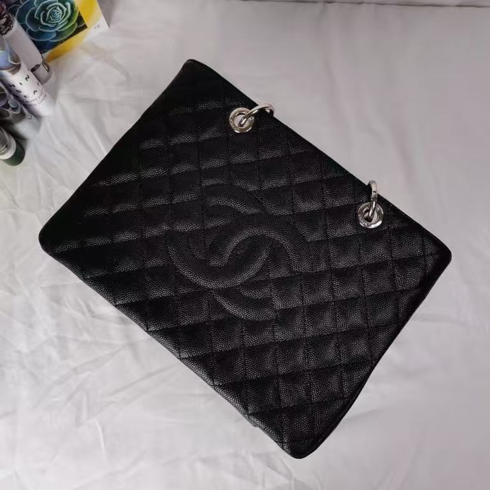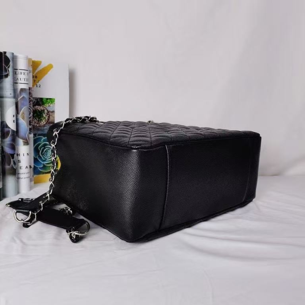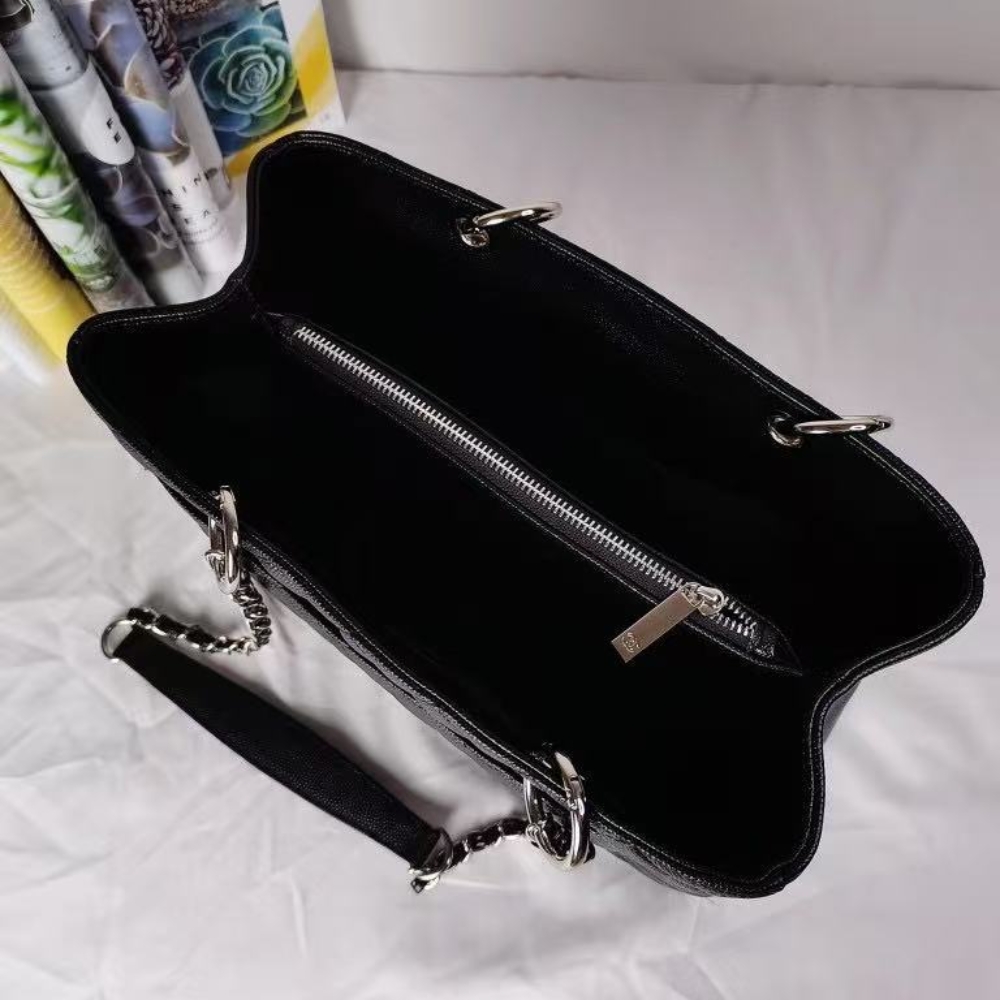 The Chanel Grand Shopping Tote in black caviar leather features silver-tone chain handles and a spacious 34cm silhouette. A timeless, everyday tote that blends durability, elegance, and iconic Chanel style.