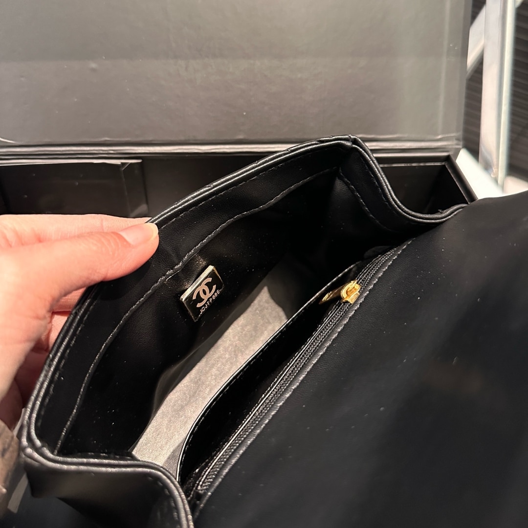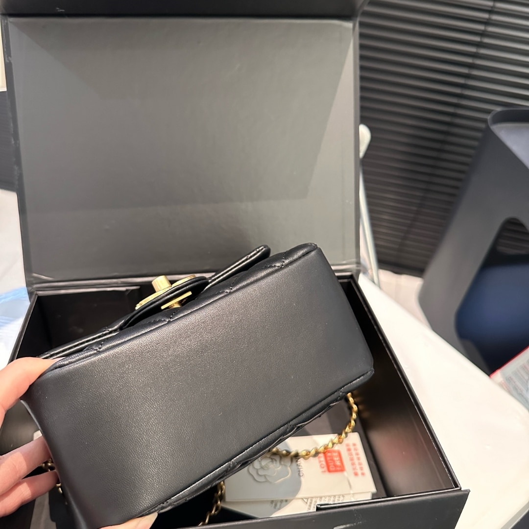 The Chanel Mini Flap Bag in Black features a shiny quilted leather design with a chain adorned with imitation pearls and gold-tone metal. At 17cm, this compact bag combines elegance and luxury, perfect for adding a touch of sophistication to any outfit.