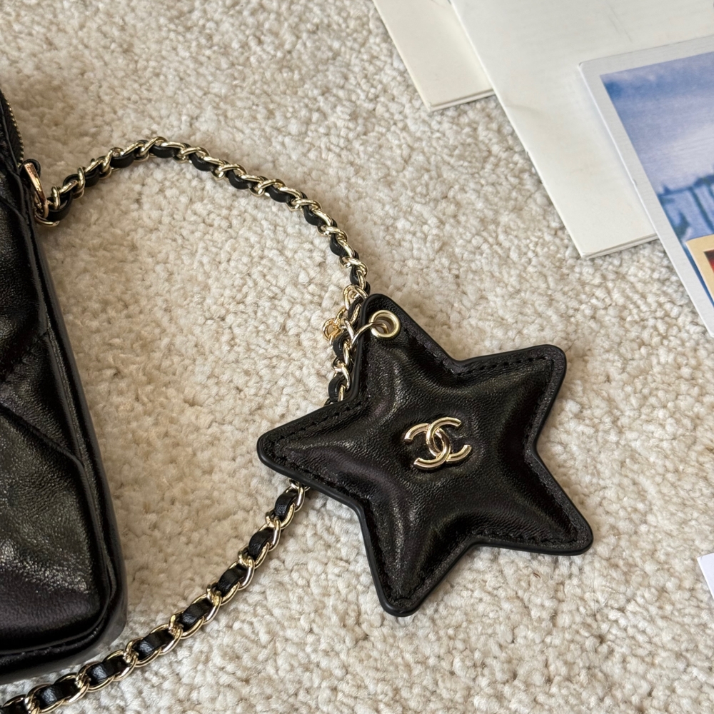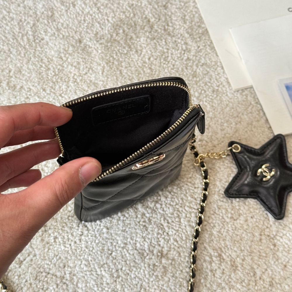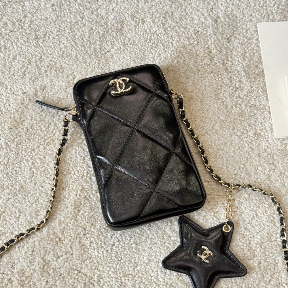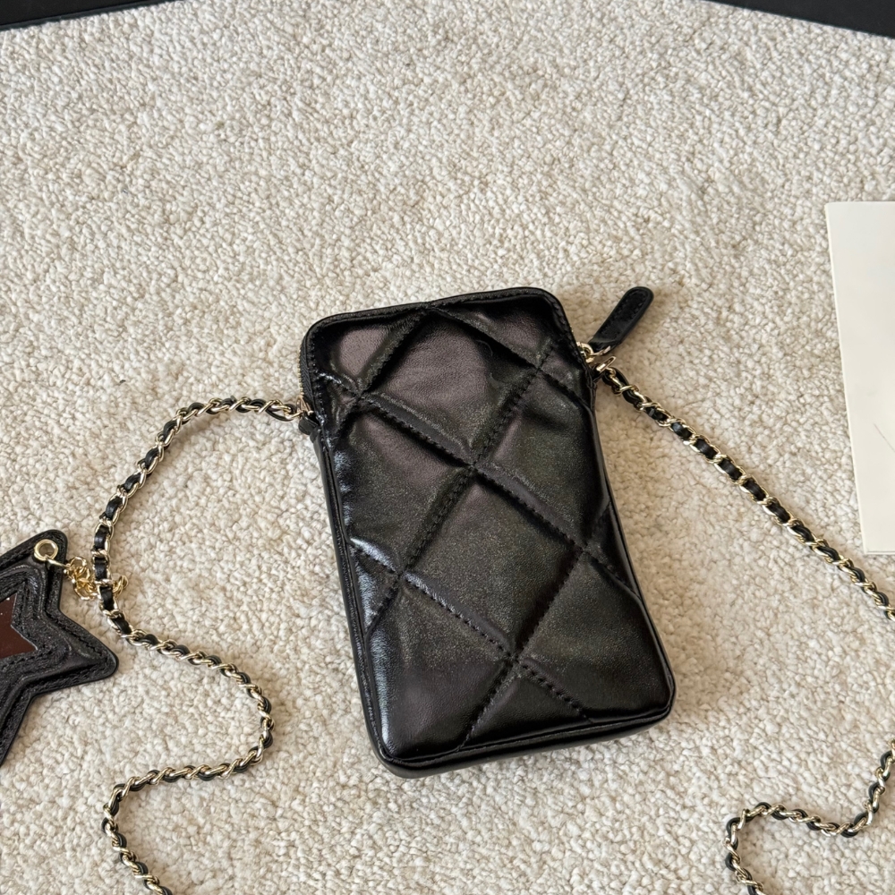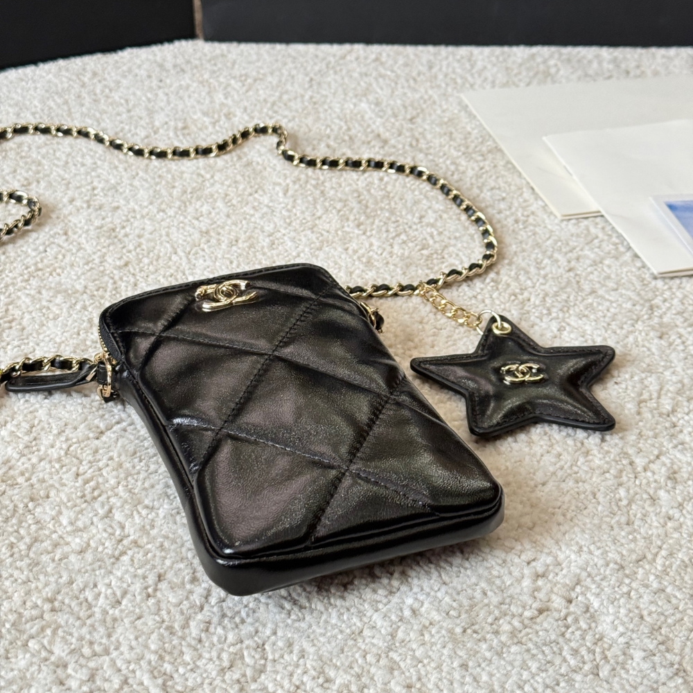 Chanel Phone Holder With Chain Shiny Crumpled And Gold Tone Metal Black 18Cm Ap4777 B21296 94305