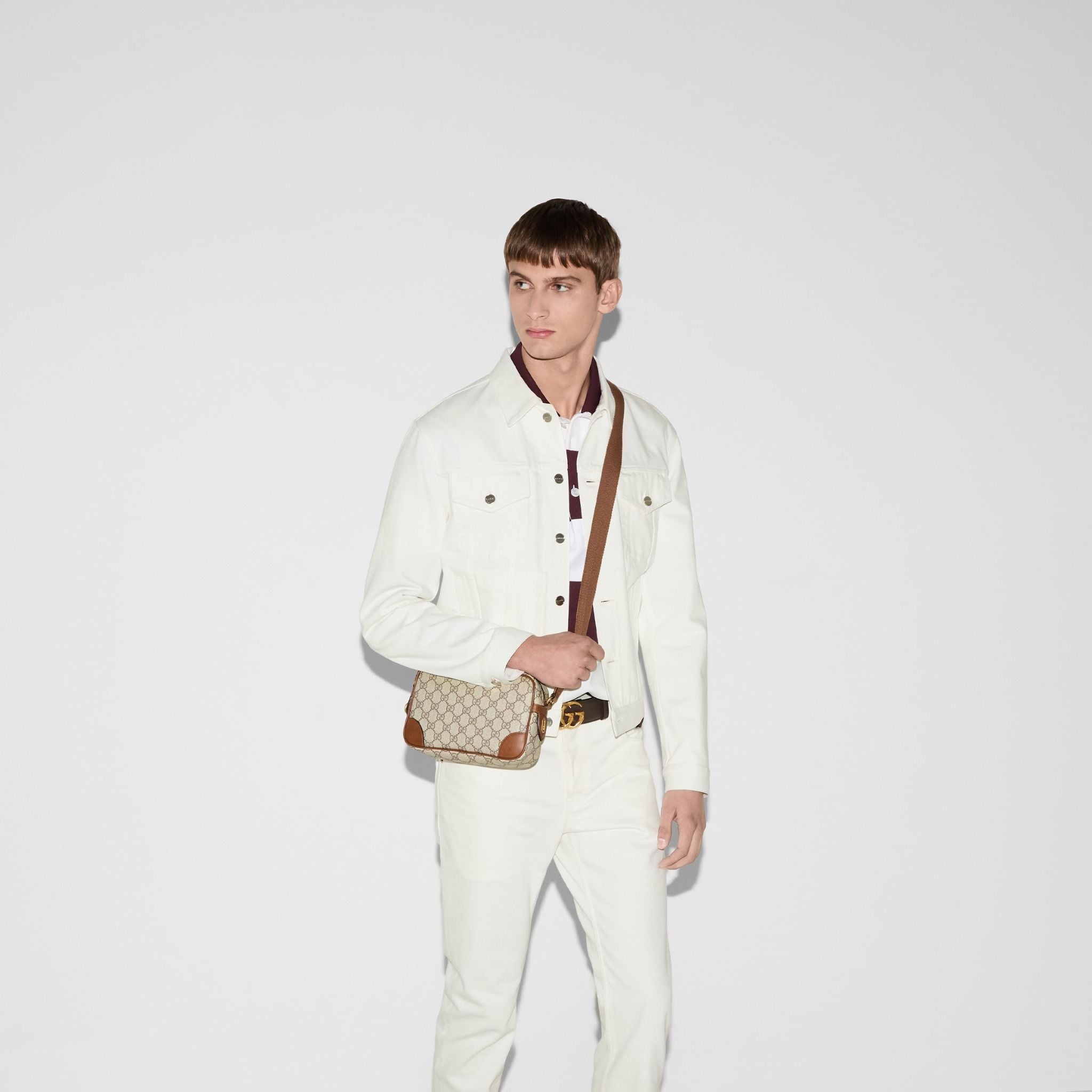 The new GG Emblem collection for men’s travel reinterprets the House’s history of elegance and craftsmanship. This cross-body bag is crafted from the new GG Monogram coated fabric and features a detachable handle.