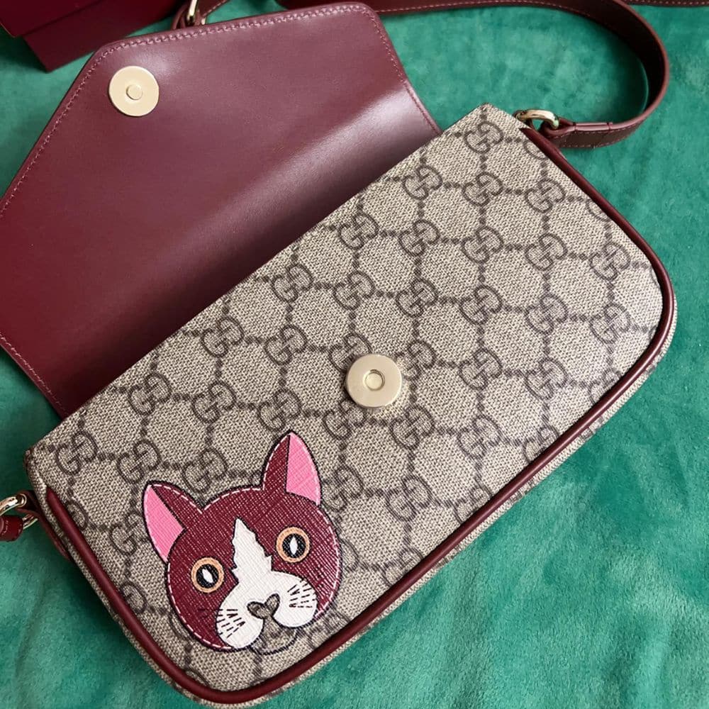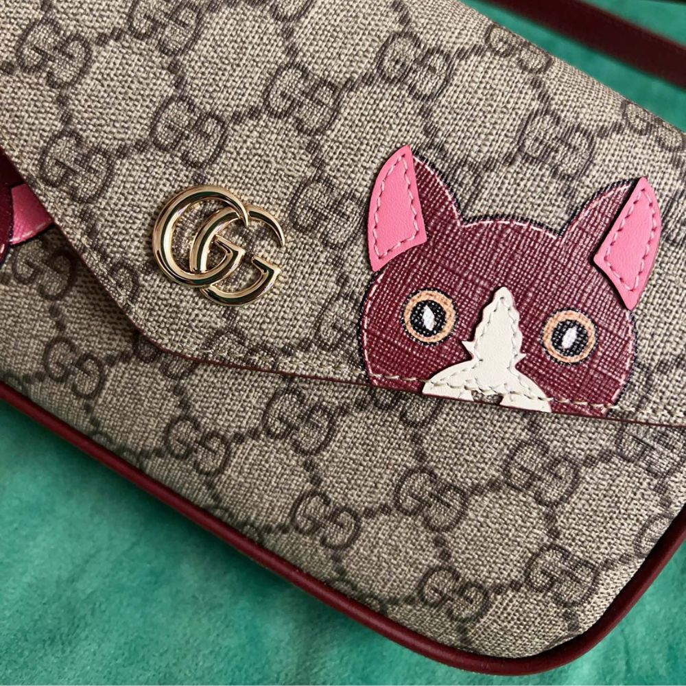 Gucci Gg Mini Shoulder Bag With Cat Detail Beige And Dark Brown 22Cm