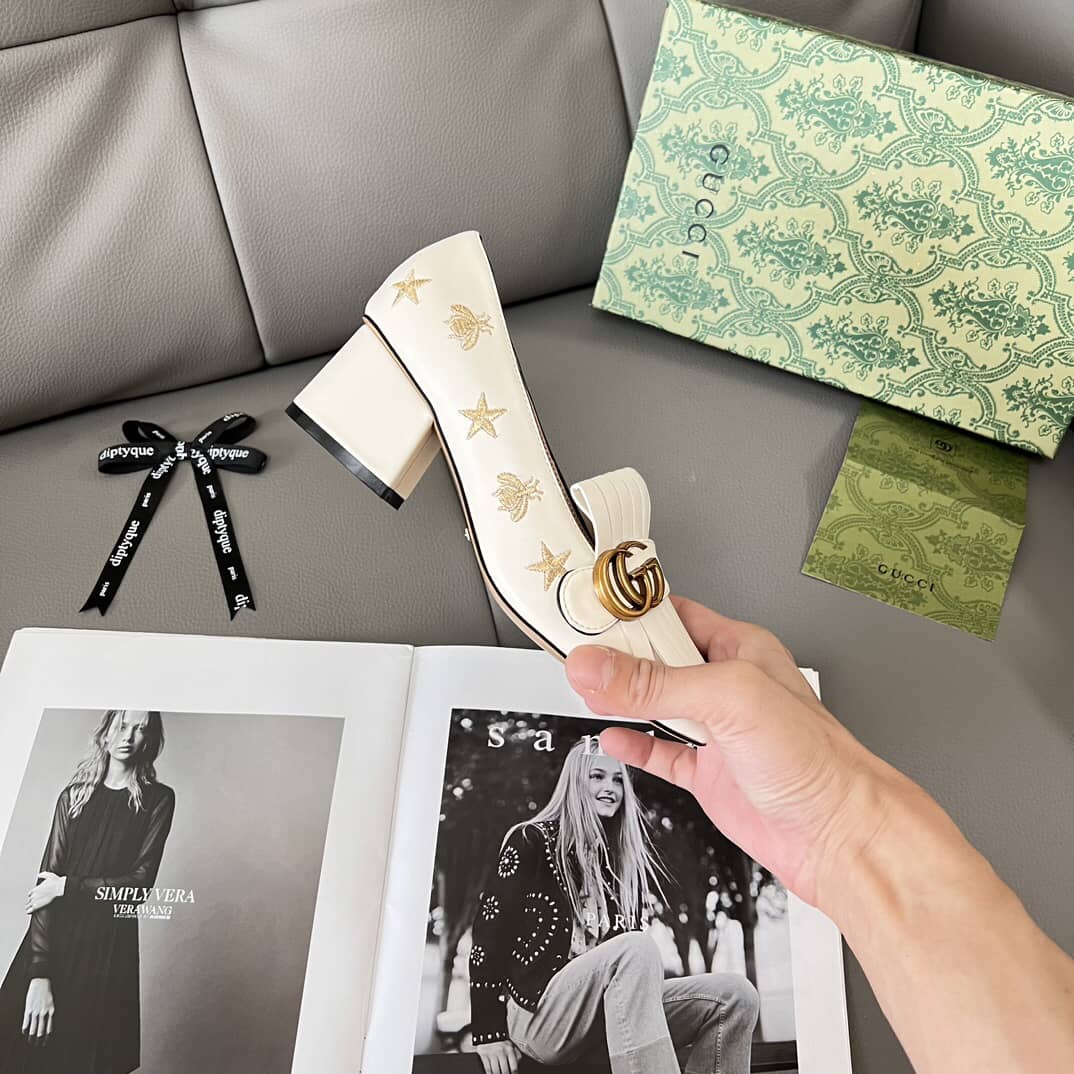 Gucci Marmont Embroidered Leather Mid Heel Pump Bee Star White 551548 D3v00 9022