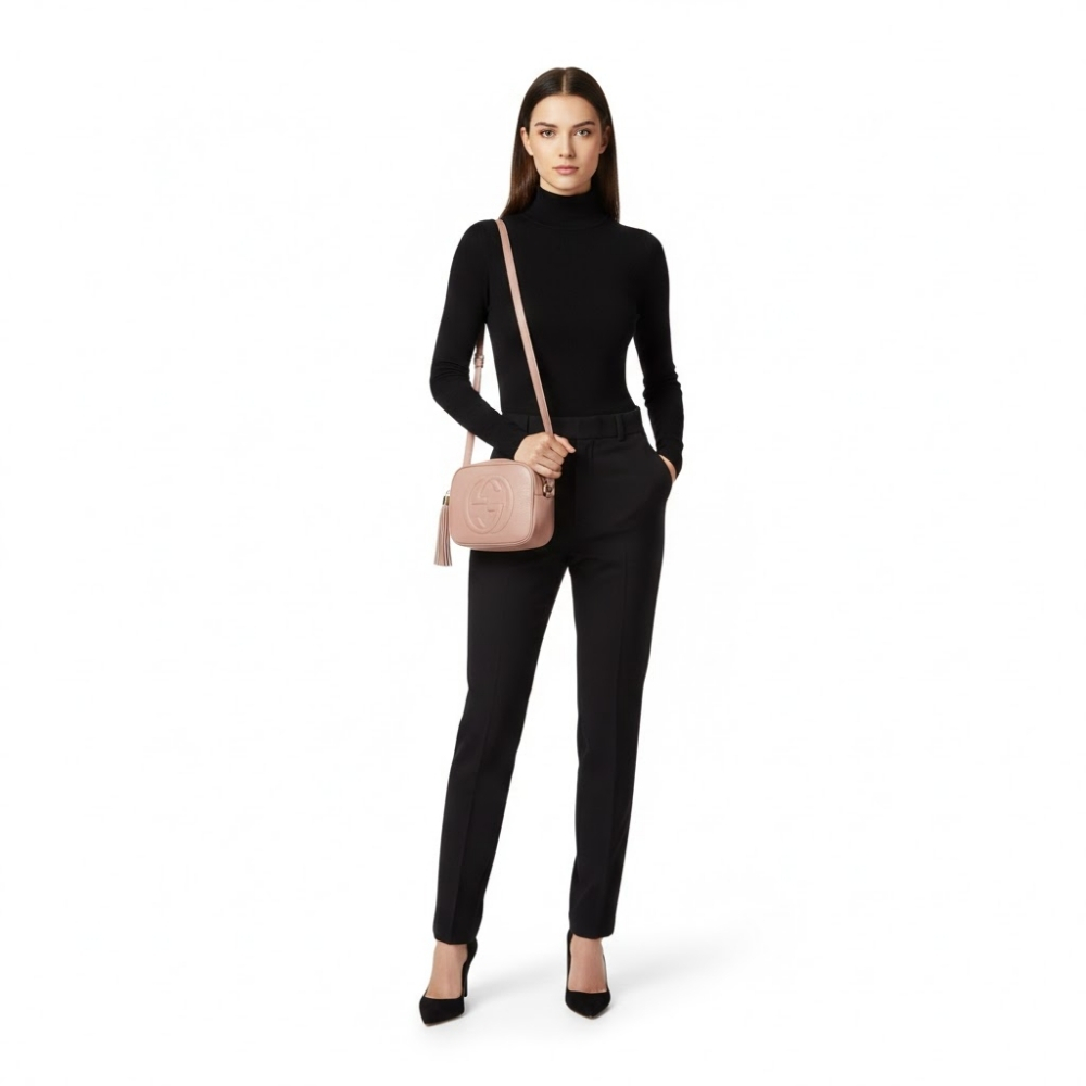 The Gucci Soho Small Disco Bag in pink is the perfect blend of minimalist style and Italian luxury, expertly crafted from premium grained leather featuring the iconic embossed interlocking GG logo. This bag offers ideal storage for your daily essentials and is accented by a stylish leather tassel on the zipper pull. The adjustable shoulder strap provides versatile carrying options, allowing you to effortlessly transition from a dynamic crossbody to an elegant shoulder look.