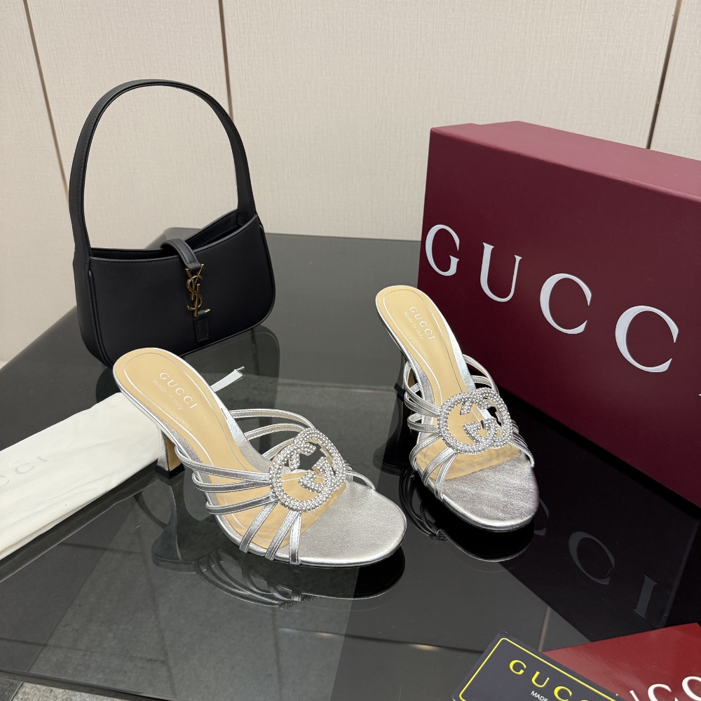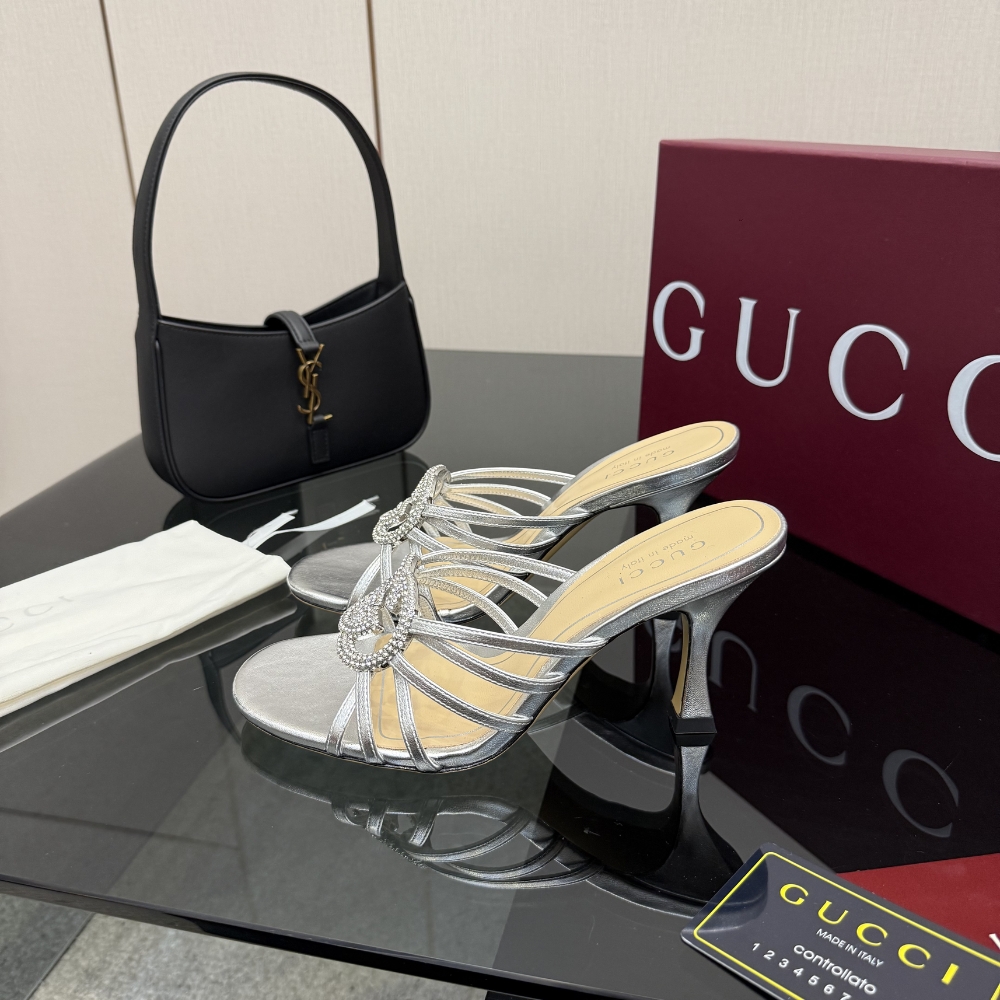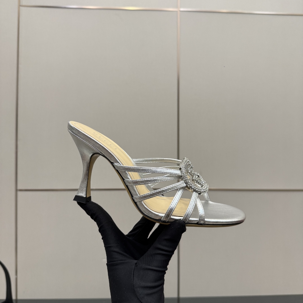 Gucci Women Slide Sandal With Crystal Interlocking G Silver 852663 0Mw00 8106