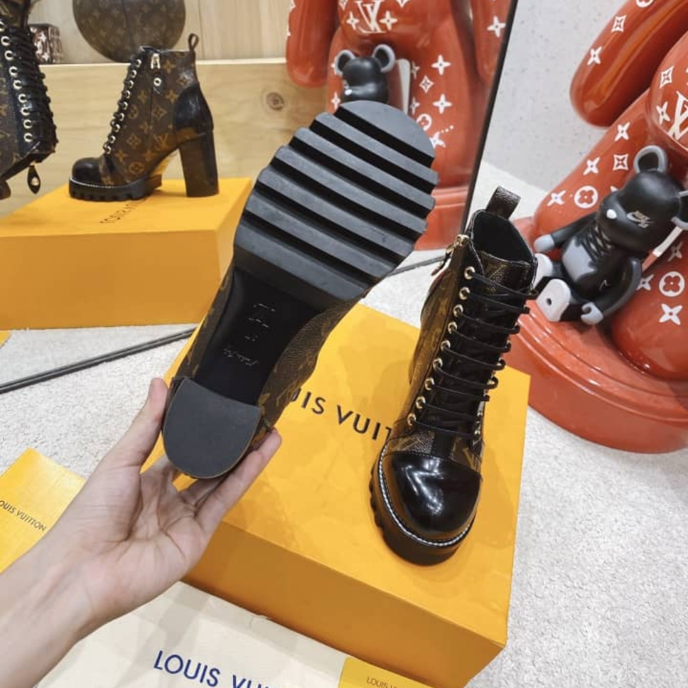 The Star Trail ankle boot, one of Louis Vuitton’s most instantly recognizable designs, is interpreted in patent Monogram canvas for a truly iconic look. Black calf leather trim brings a chic twist to this army-inspired style with its leather laces and rugged platform sole.
