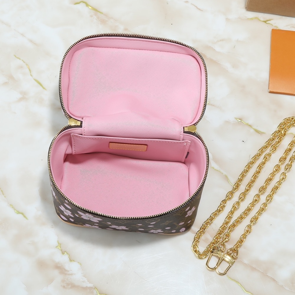 The Nice Mini toiletry bag is crafted in a rounded boxy shape in bijou proportions from the House’s classic Monogram coated canvas, which is playfully overlaid with celebratory Cherry Blossom motifs from the re-edition of the Louis Vuitton x Takashi Murakami collection. A natural cowhide leather top handle adds a chic and practical detail to the top, while a golden double zipper fastening keeps personal items secure.