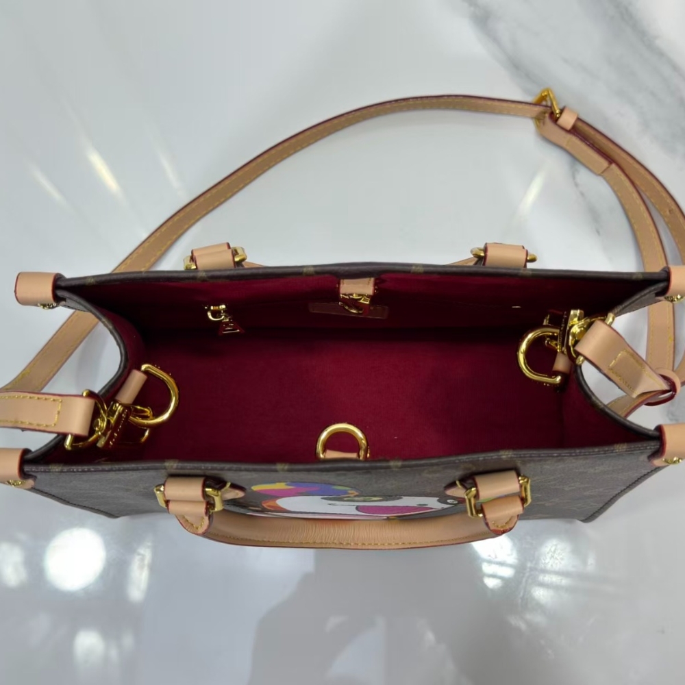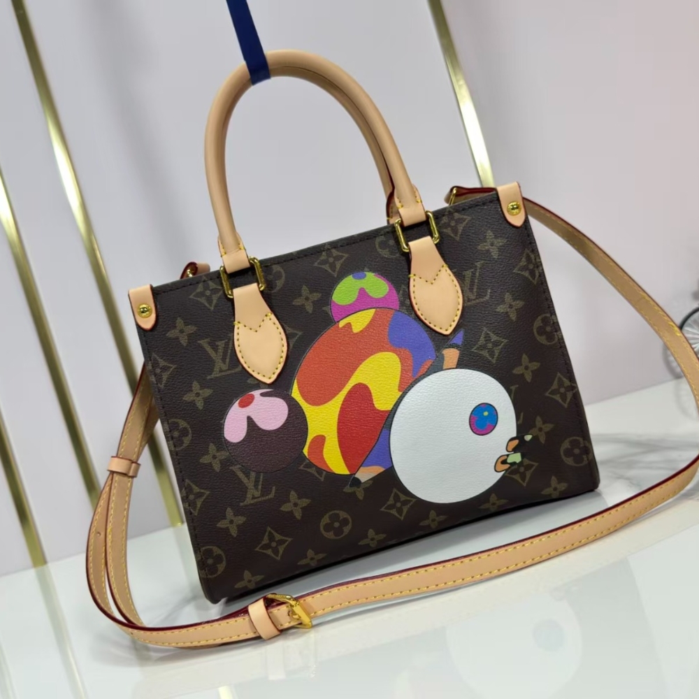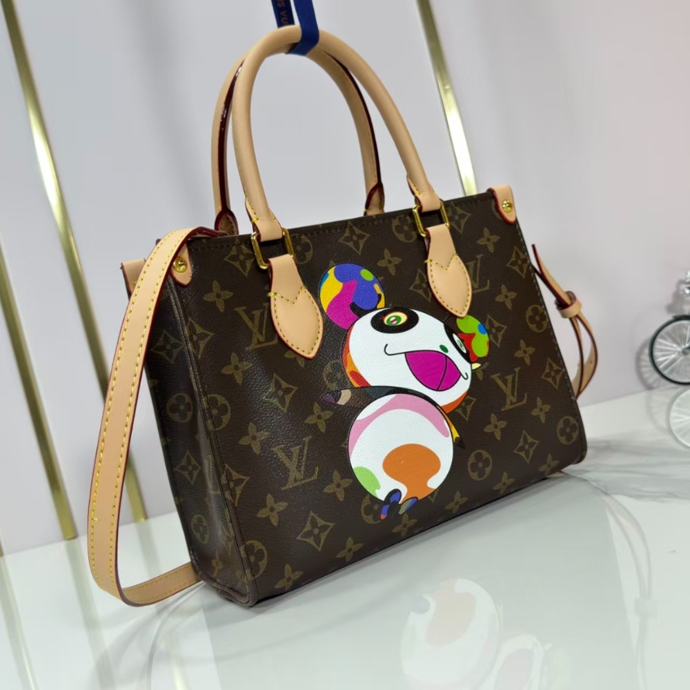 This bijou edition of the classic OnTheGo handbag is part of the playful re-edition of the Louis Vuitton x Murakami collection. It projects timeless Louis Vuitton codes in Monogram canvas trimmed with leather accents, while the front and back are uplifted with the artist’s signature Panda character printed in vibrant hues. A removable, adjustable strap offers versatile carry options, while an interior flat zipper pocket secures personal items.