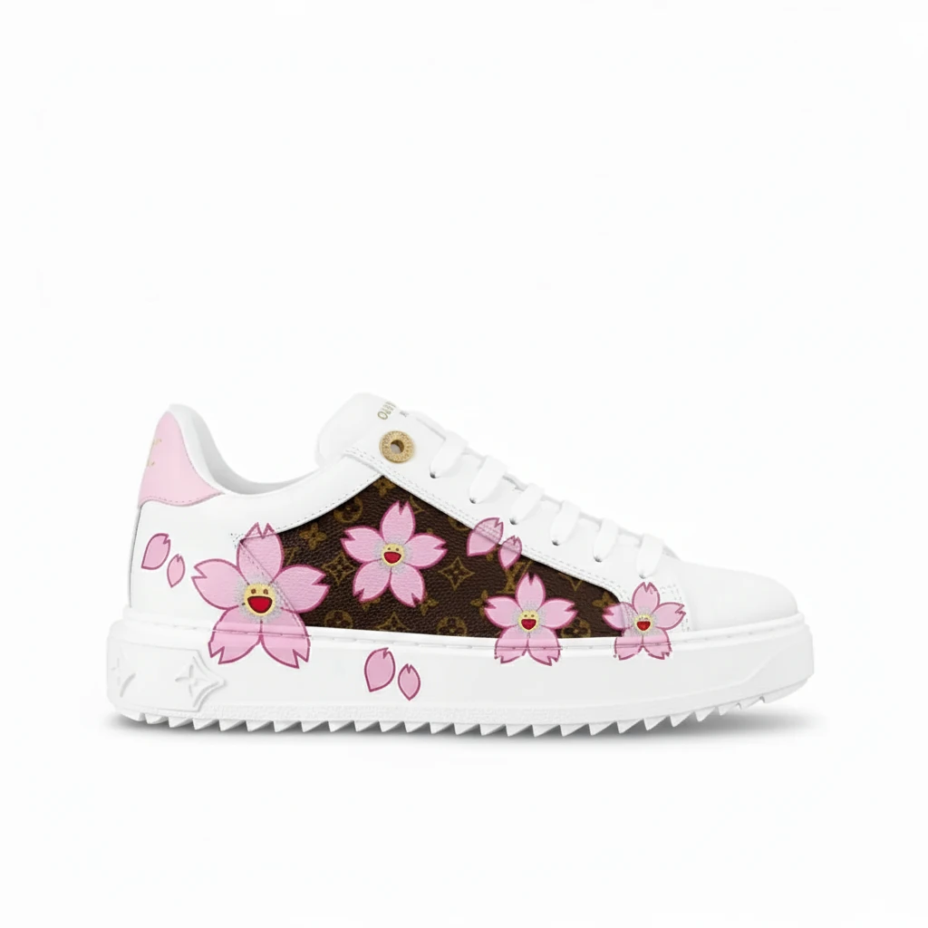 Refreshed with codes from the re-edition of the iconic Louis Vuitton x Takashi Murakami collection, the Time Out sneaker makes a spirited and sporty statement. Crafted from plain leather, Monogram accents add a classic House touch, while vibrant printed Cherry Blossom motifs introduce a joyful burst of color, complemented by a pink trim at the back. Monogram Flowers add a final signature to the elevated rubber outsole.