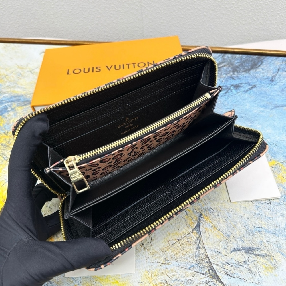 - 12 card slots, patch pockets, and a leopard-print, zipper compartment