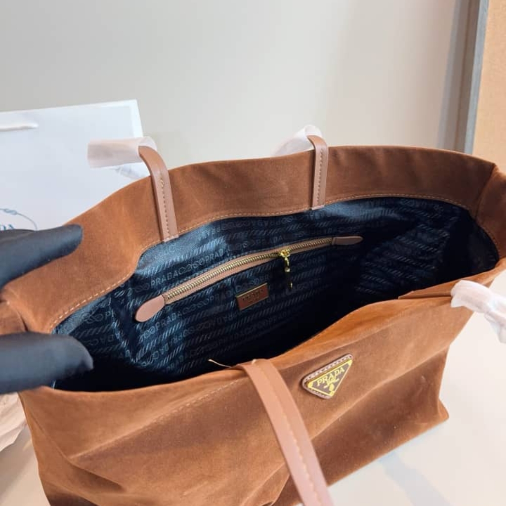 The Prada Suede Tote Bag in Brown is a luxurious and tactile essential that embodies the brand’s signature minimalist sophistication. Often identified as the Bonnie Large Suede Handbag or the Medium Suede Tote, this silhouette is characterized by its clean lines, supple calf suede construction, and subtle branding.