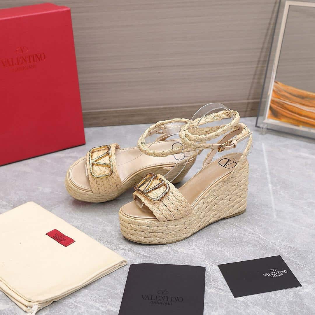 Valentino Garavani Vlogo Raffia Platform Wedge Sandals Natural